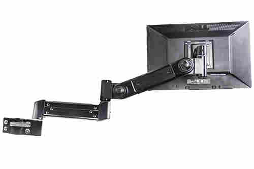The adjustable arm provides vertical positioning from the vertical (Up) to horizontal (down) positions. The extension arm provides additional left right pivot and positioning options by utilizing 3 pivot points. The LCD disply mounting bracket provides left / right pivot, forward / back tilt as well as portrait / landscape rotational positioning.