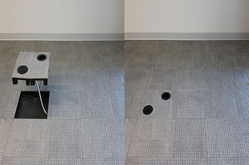 The images below show how easy it is to reconfigure the locations for power and data connections. In this conference room, the customer needs to relocate several of the power outlets to align them with a new furniture layout. This entire process took 30 minutes to complete and the end user performed the change with their own personnel. No special tools or hard wiring required.