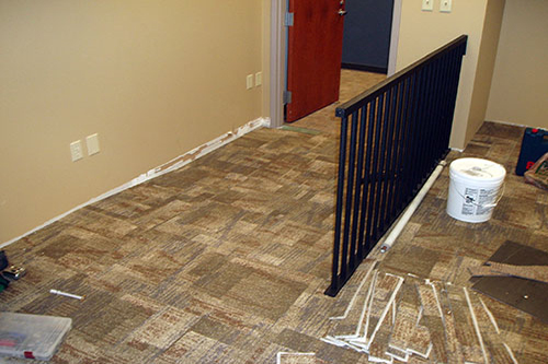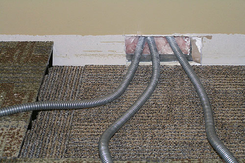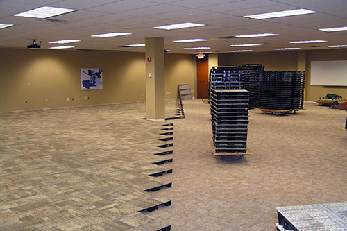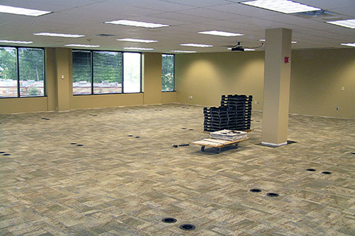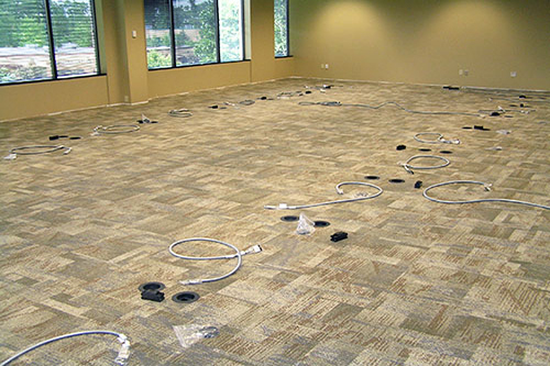 The project shown below is an 1800 S/F training room. The customer required 40 duplex power outlets and 25 duplex communication connections throughout the space. The power was distributed over 10 circuits. The customer required the ability to relocate their power and data connections as the room usage and furniture configurations changed. In addition, the room was in use nearly 24 hrs/day, so downtime for installation was a factor. Powerflor provide them the ability to locate their power and data connections wherever necessary, whenever necessary. Installation was completed in 3 working days with 4 installers and minimal impact on employees.